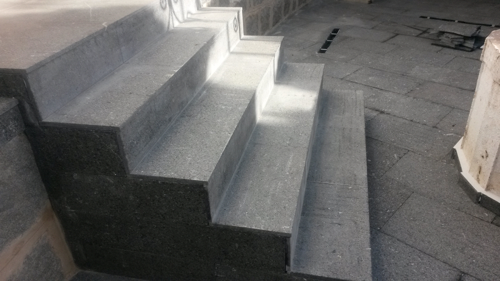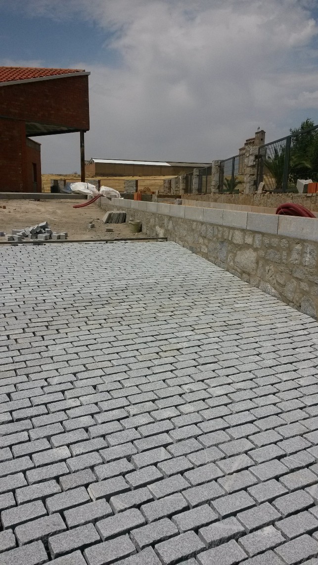 Obra en chalet con adoquines, peldaños y losas de granito Gris Quintana